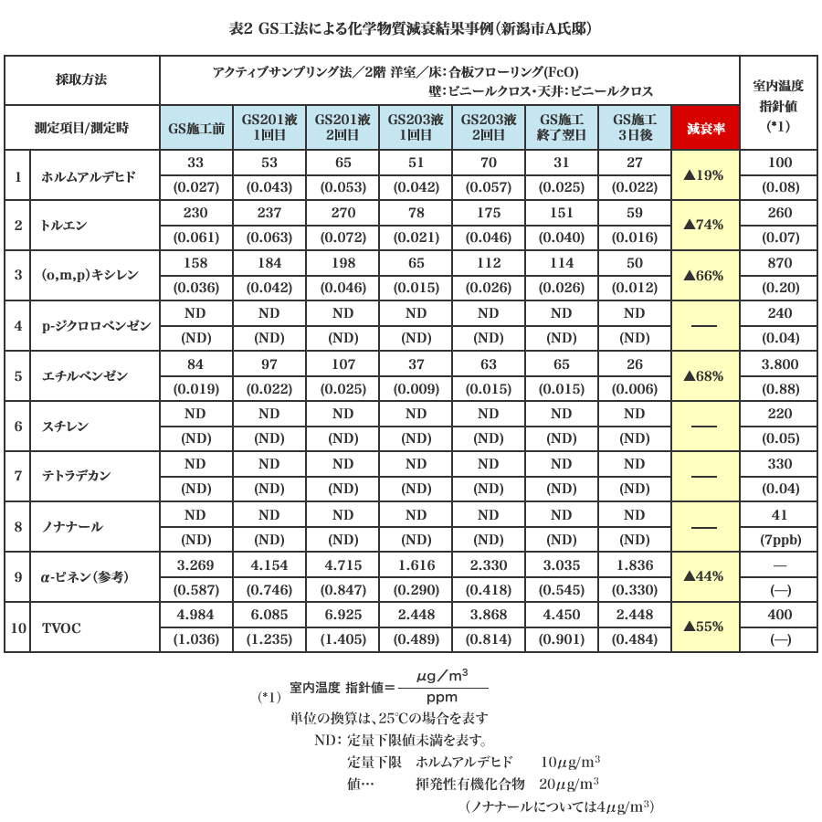 次に「W'PHIXZ-Able工法」施工後の測定結果を見てほしい。表1を見てみると、ホルムアルデヒドの減衰率は50~90%台を達成している。また、ホルムアルデヒド以外のトルエン・キシレン・エチルベンゼン、さらにはTVOC(VOC総量)についても、40~70%の減衰率を達成している(表2)。この結果は入居者はもとより、実験に立会った建築関係者からも想像以上であるとの高い支持を得た。