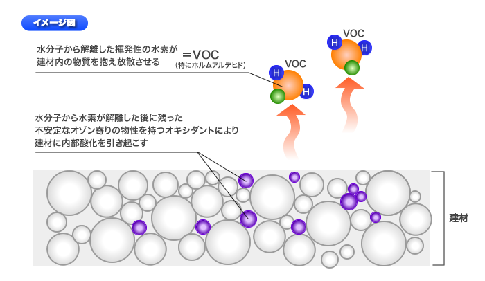 その主たる原因は、現代建築ではどうしても使用を免れえない、化学合成新建材に含まれる可塑剤・架橋剤、または木質建材につきものの保存剤にあることは、すでに知られている。これらの、多種多様な化学合成剤に使用されている普通水(自由水の多い水)は、本来、建材内部で安定しているべき「結合水」にはなり得ず、崩壊・蒸散しやすい。まずH2O水分子から解離した、揮発性の水素(H)がさまざまな化学物質を引き寄せながら一気に蒸散し始める。この「水の崩れ」こそが永続的に続くVOC類の発生原因である。一方、水素が解離してしまった後の、強い活性力を持つ、オゾン寄りの物性を示すオキシダントが、建材内部に残された化学合成剤の成分と反応し、建材内部で酸化現象を引き起こし、製造時に使用されていない物質が生成され、建材にも劣化現象をもたらしている。