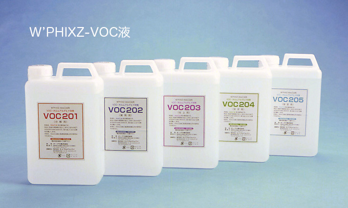 当社のVOC対策の研究は「蒸散しやすい結合水」と「蒸散しにくい結合水」の概念から研究開発が始まっている。「結合水」と同等に微粒子化させ、安定した原水(VOC液)をベース液とし、物質反応別に微量元素を配合する。一方は揮発化の方向に崩れたVOC類を分解して放散させるもの。もう一方は、まだ安定性を維持している「結合水」に対して、さらにその結合力を強化させ、建材内部においてさらに安定させることが可能になるもの。